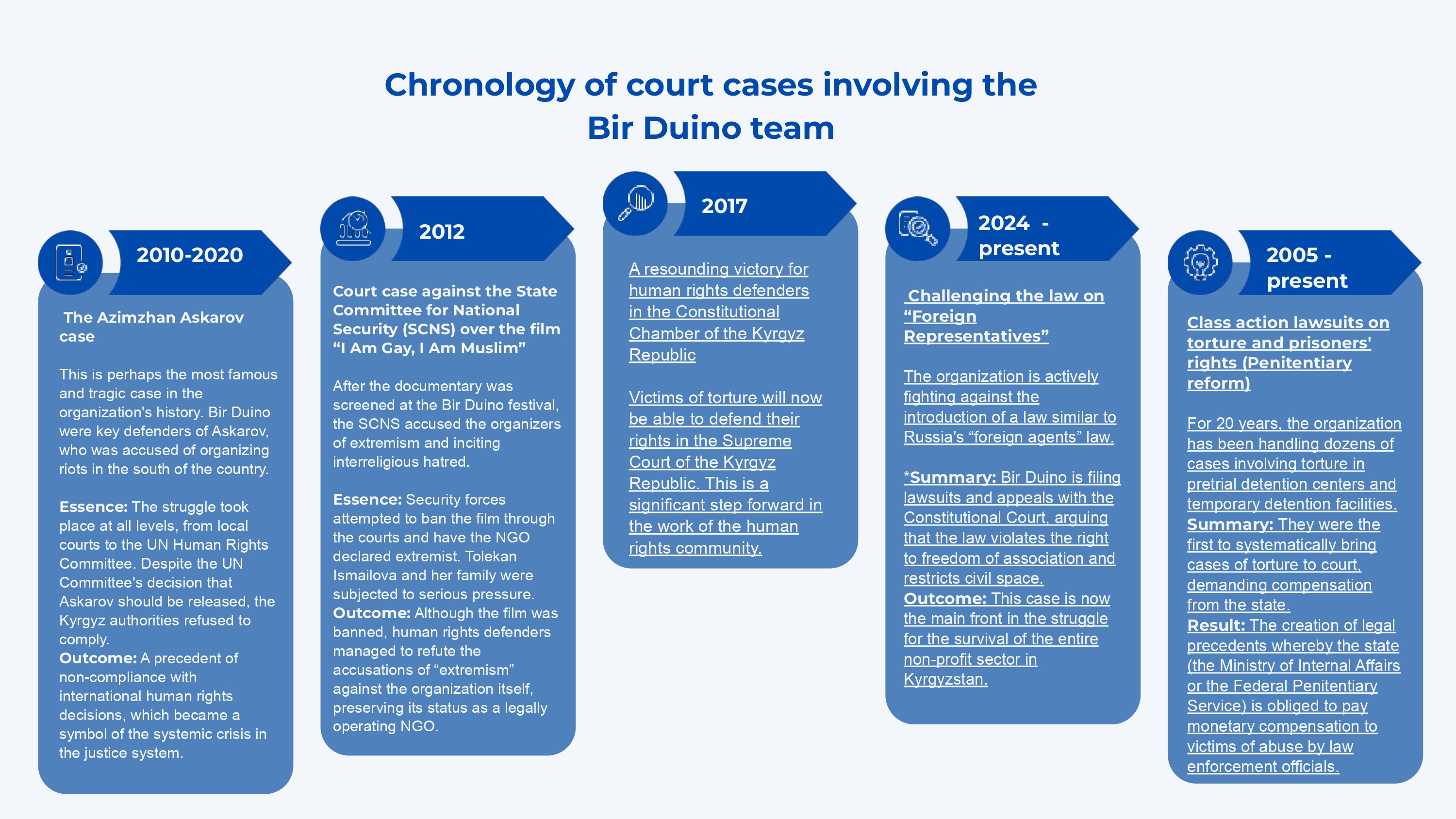 The case of Shukurullo Kochkarov shows that work on complex cases continues for many years. After the torture he was subjected to in 2010, he became disabled. We managed to get acquittal on one of the charges; the work is ongoing on achieving his rehabilitation and recognition as a victim of torture in order for compensation to be paid. Trials continue without Shukurullo Kochkarov - he died on 2 August 2019. His interests are represented by his father, Saidaziz Kochkarov, who also has a visual disability. “For many years, we have been supported by the employees of BDK, they have been handling the case of my son, they brought him to court because he couldn’t walk on his own, they constantly help our family: my wife and I underwent rehabilitation, they have helped my son by providing him with medicines, they provide all kinds of help”.