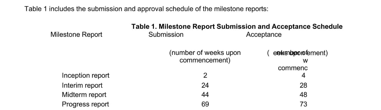 Table 1 includes the submission and approval schedule of the milestone reports: